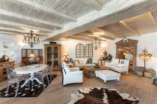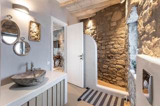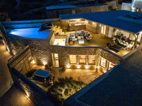 This elegant three-floor villa is designed to provide a sense of serenity and exclusivity for up to 12 guests. The villa's indoor area exudes a blend of rustic charm and modern comfort, beginning with two spacious living areas, featuring wooden beams and natural stone accents, creating a warm and inviting ambiance. Adjacent is a fully-equipped kitchen with modern appliances, ample counter space, and stylish cabinetry. The office room offers a quiet and productive workspace with essential technology and ergonomic furniture. The villa boasts six bedrooms, five bathrooms and one guest WC, all featuring high-quality fixtures and elegant finishes, ensuring a harmonious and functional living environment.
