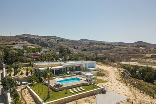 Upon entering the villas ground floor, you will be greeted by a spacious and inviting open-plan layout that effortlessly blends elegance with functionality. To the right, a sprawling living area awaits, featuring a generously sized sofa, two plush armchairs, and a cozy fireplace. Adjacent to the living space, an indoor dining area, offering a refined setting for shared meals and memorable gatherings. At the heart of it all lays a meticulously designed island-style kitchen, boasting top-quality fixtures and appliances, where culinary delights are brought to life with ease and finesse. On the left side of the ground floor, a haven of tranquility awaits in the form of three beautifully-appointed bedrooms. The master bedroom, adorned with a sumptuous king-size bed, awaits to cocoon guests in pure comfort. A private en-suite bathroom, complete with a soothing Jacuzzi, adds an indulgent touch to the experience. The remaining two bedrooms feature double beds and offer direct access to the outdoor area and the inviting pool, ensuring convenience and serenity for all guests. Completing the accommodation on this floor is a well-appointed bathroom with a shower, as well as a separate WC.