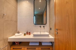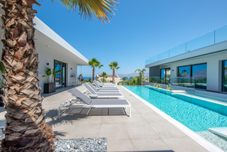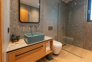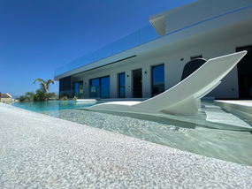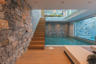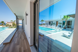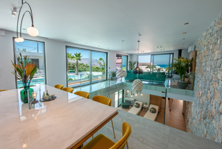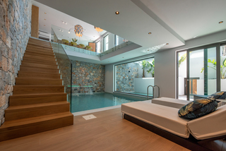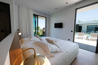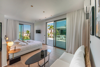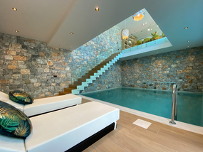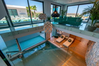 The tranquil allure of the lower level boasts the interior balcony that divides the culinary zone from the lounge space. Stairs lead down to this uber-chic level, where you will find an inviting indoor pool area adorned with comfortable loungers and a shared bathroom. Here, two additional bedrooms boasting en-suite bathrooms await, each with direct access to the terrace. One more double en-suite bedroom is situated on the upper level, providing ample space and privacy for guests to unwind in privacy and recharge.
