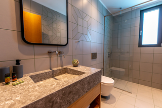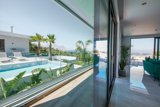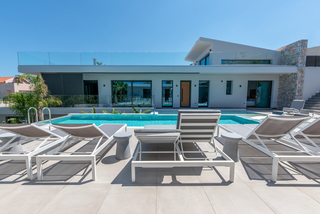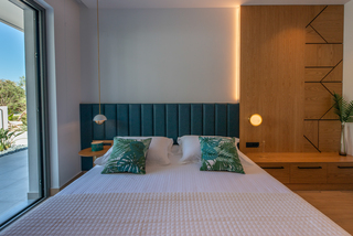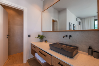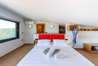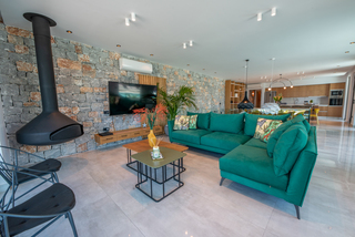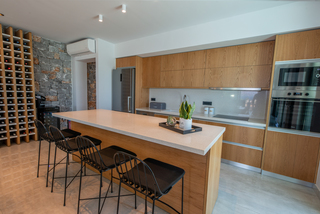 The lavish residence unfolds across two buildings and three floors, comfortably accommodating up to 14 guests, making up a secluded oasis for family reunions or large groups seeking to holiday together. Upon entering the ground level of the main building, you are greeted by the minimalistic, bright open-plan expanse, adorned with an ultra modern, airy living area complemented by a large window, which floods the space with natural light while offering breathtaking views of the sublime outdoor setting. Adjacent, you will find a chic fully-equipped kitchen and a 12-seat dining area. The kitchen island, crafted with a sleek countertop, stands as the focal point of the culinary space, exuding both functionality and elegance. The same level also comprises a double bedroom with an en-suite bathroom, beckoning endless moments of relaxation.