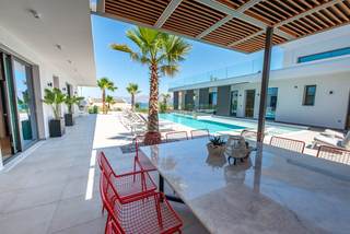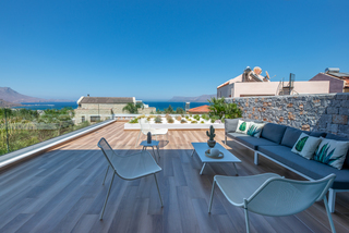 The magnificent exterior of the property unveils a sanctuary of indulgence and serenity. Guests can indulge in leisurely swims in the glistening swimming pool, bask in the warm Mediterranean sun on comfortable sun loungers, or unwind in inviting lounging areas idyllically positioned throughout the terrace. Families with young children will delight in the endless hours of fun and entertainment that the superb childens' pool will offer. For memorable dining experiences under the Cretan sky, a shaded dining area awaits, complete with open-air BBQ facilities for sizzling culinary delights. Whether lounging under the shade or soaking in the sun-drenched terrace, this architectural gem offers the perfect blend of comfort and sophistication.